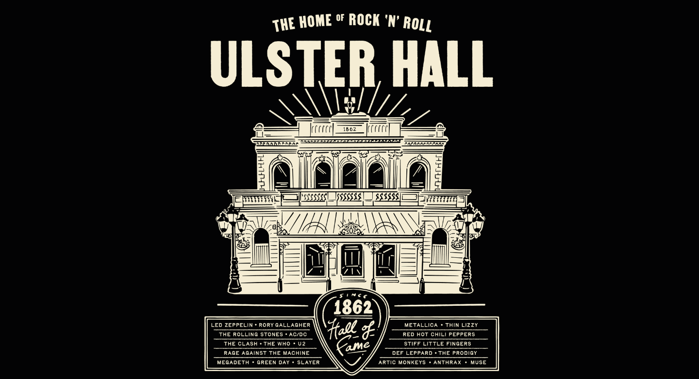 To complete the transformation, we asked Belfast illustrator Thomas Bannon to create exclusive artwork that crowns the iconic venue, flashes back to 1862 and frames a guitar pick Hall of Fame surrounded by names that have shaken these walls, from Led Zeppelin, Rory Gallagher and Thin Lizzy to Stiff Little Fingers, U2, Metallica, The Prodigy and more.